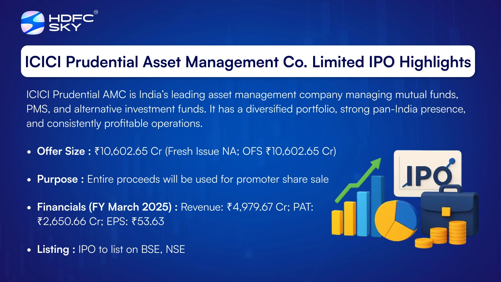 ICICI Prudential AMC IPO is a book building issue of ₹10,602.65 crore, entirely an offer for sale of 4.90 crore shares. The IPO opens on 12 December 2025 and closes on 16 December 2025. Tentative allotment will be finalised on 17 December 2025, with refunds initiated and shares credited on 18 December 2025. The IPO is set to list on BSE and NSE on 19 December 2025. The price band is ₹2,061–₹2,165 per share. The minimum lot size is 6 shares for retail investors, while sNII and bNII have larger lot requirements. Citigroup Global Markets India Pvt. Ltd. is the book running lead manager, and Kfin Technologies Ltd. is the registrar.