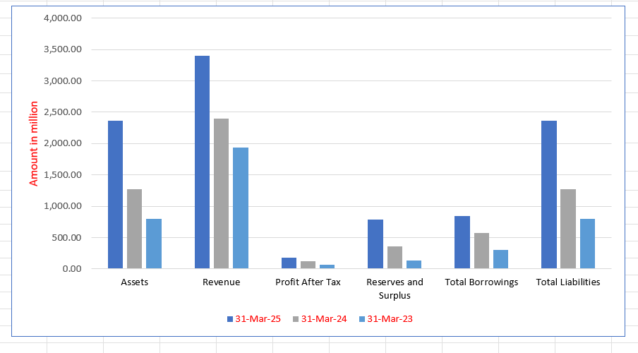 Madhur Iron & Steel (India) Limited has demonstrated a consistent track record of revenue growth, profitability, and operational efficiency. Its revenue from operations grew at a CAGR of approximately 32.69% from Fiscal 2023 to Fiscal 2025, reaching ₹3,395.64 million. Profit after tax also increased significantly from ₹65.25 million in Fiscal 2023 to ₹181.23 million in Fiscal 2025, reflecting the company’s ability to achieve sustainable earnings while managing expansion.