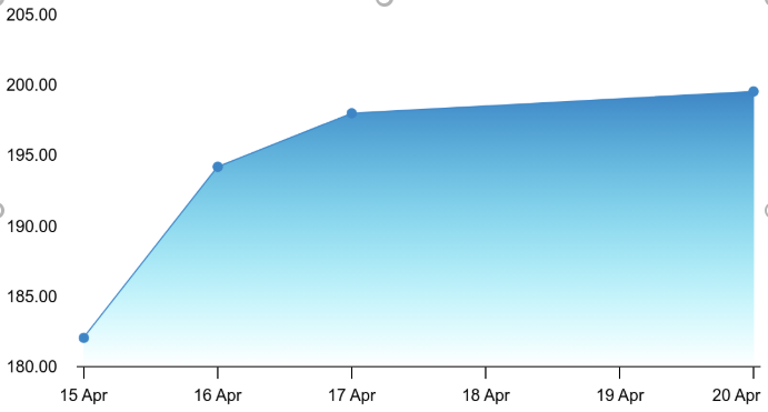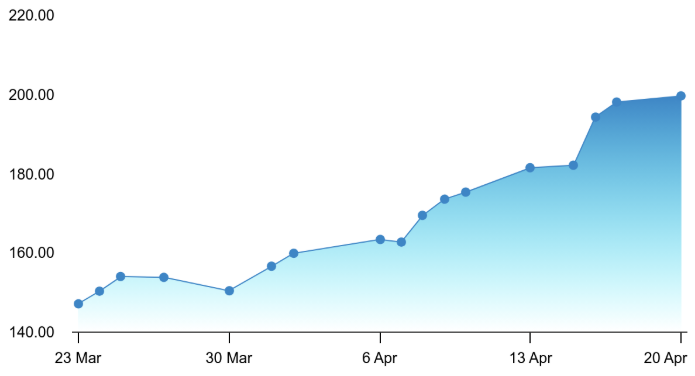 Zooming out to the one-month picture, the Adani Power chart tells an even more compelling story of sustained wealth creation. The stock was languishing near ₹147–₹148 around March 23 before beginning a steady grind higher through late March, crossing ₹160 by early April and ₹175 by mid-April. The sharp acceleration from April 15 onwards — taking the stock from ₹182 all the way to ₹200 — means Adani Power has delivered a remarkable gain of approximately 36% in just one month, making it one of the strongest performers in the power sector over this period.