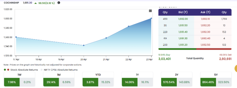 Mumbai, April 24: Shares of Cochin Shipyard are soaring through the roof on Friday morning, rallying strongly while the broader markets trade lower as buying interest in the defence shipbuilding stock intensifies.