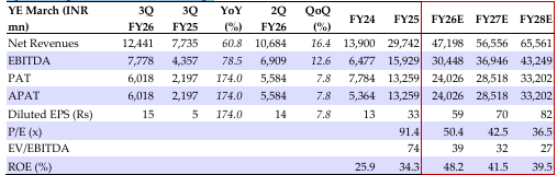 We expect revenue growth of +58.7/19.8/15.9% and EBITDA margins of 64.5/65.3/66.0% in FY26/27/28E respectively. Revenue CAGR of 30.1% over FY25-28E assumes derivatives revenues of INR 30/37/44bn in FY26/27/28E. Core PAT CAGR over FY25-28E is at 35.8%.