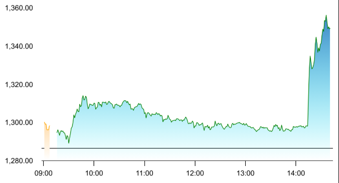 Stock opened at around ₹1,298–1,300 in the pre-market. Price fell soon after the opening to hit a session low of around ₹1,287 at 9:15 am. It then traded with very little upside or downside in a tight ₹1,287–1,295 band most of the morning till early afternoon as investors awaited the Board Meeting results. Only in the last session did the stock tear higher in a near-vertical move. From around 14: 15 am onwards, Nestle zoomed up from ₹1,298 to hit a session high of around ₹1,357 by 14:50 am. Against the previous close of ₹1,286.40, the stock climbed as much as 5.5% at its intraday highs.