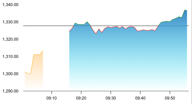 At the time of writing, the stock had managed to post gains and was up 0.68 percent at Rs 1,336.80. Source: NSE