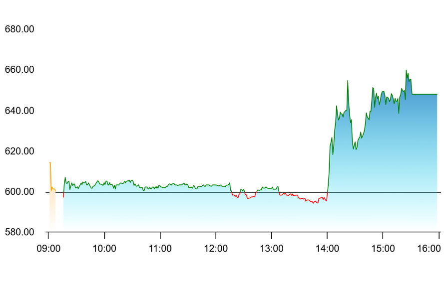 Results were shortly thereafter released and traded on the exchanges. From this point forward it was game on: the stock took off, blasting from ₹596 to an intraday high of around ₹654 in minutes, for a gain of over 9% intraday. Shares last traded at ₹655, up ₹55.40 or 9.24% from the previous close of ₹599.60, and closed around ₹647.70, up 8.02% for the day.