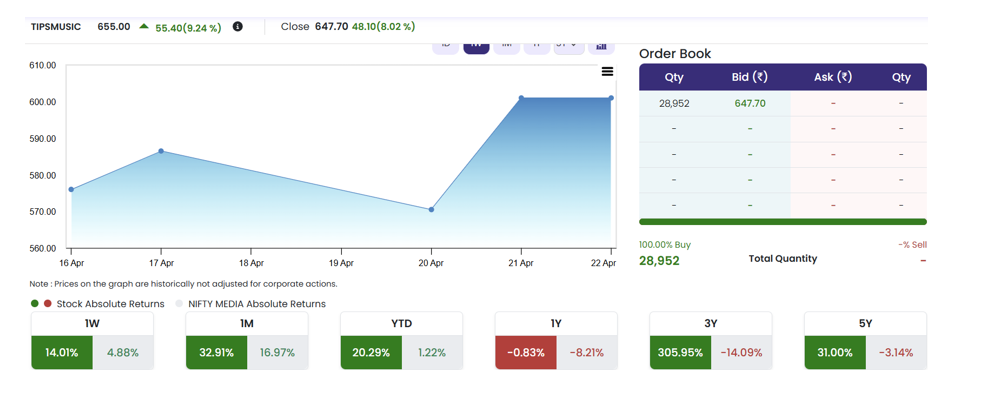 Over the last five trading sessions, the stock opened around ₹576 on April 16, fell to a weekly low of about ₹570 on April 20, then bounced back to ₹601 on April 21 and stayed bid through April 22. Thursday’s post-results breakout through ₹655 brought the weekly gain to about 14%, handily beating the Nifty Media index’s 4.88% rise over the same period. Buy and sell volumes paint the picture: 28,952 shares on the buy side of the order book, none on the sell side. Book scanned across all five levels of asks (prices people are willing to sell at) — and the sellers dipped: no trades, folks, sellers absolutely ghosted as the buyers kept bidding.