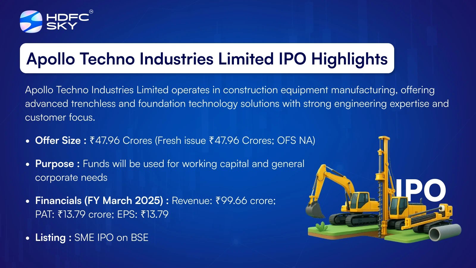 Apollo Techno Industries Limited IPO is a bookbuilding issue of ₹47.96 crore, comprising an entirely fresh issue of 36,89,000 equity shares. The IPO opens for subscription on 23 December 2025 and closes on 26 December 2025, with allotment expected on 29 December 2025. The issue will be listed on BSE SME on 31 December 2025. Beeline Capital Advisors Pvt. Ltd. is the book running lead manager, MUFG Intime India Pvt. Ltd. is the registrar, and Spread X Securities Pvt. Ltd. acts as the market maker.