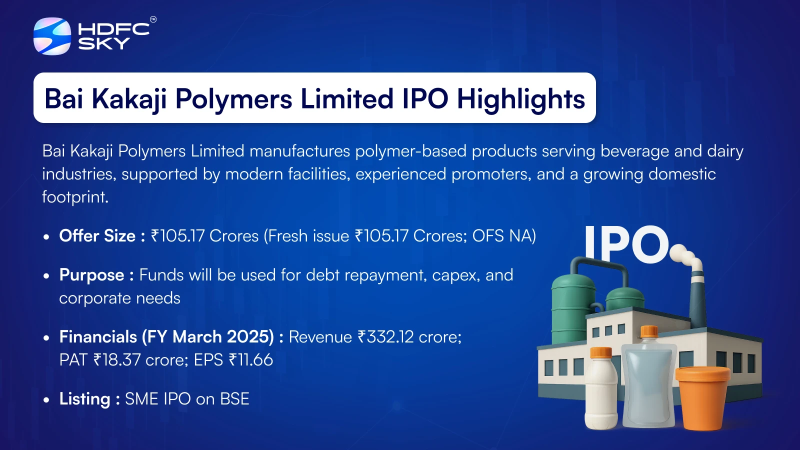 Bai Kakaji Polymers Limited IPO is a bookbuilding issue of ₹105.17 crore, consisting entirely of a fresh issue of 56,54,400 equity shares. The IPO opens for subscription on 23 December 2025 and closes on 26 December 2025. The allotment is expected on 29 December 2025, with listing scheduled on BSE SME on 31 December 2025. Hem Securities Ltd. is the book running lead manager, Maashitla Securities Pvt. Ltd. is the registrar, and Hem Finlease Pvt. Ltd. is the market maker. The lot size for bidding is 600 shares.