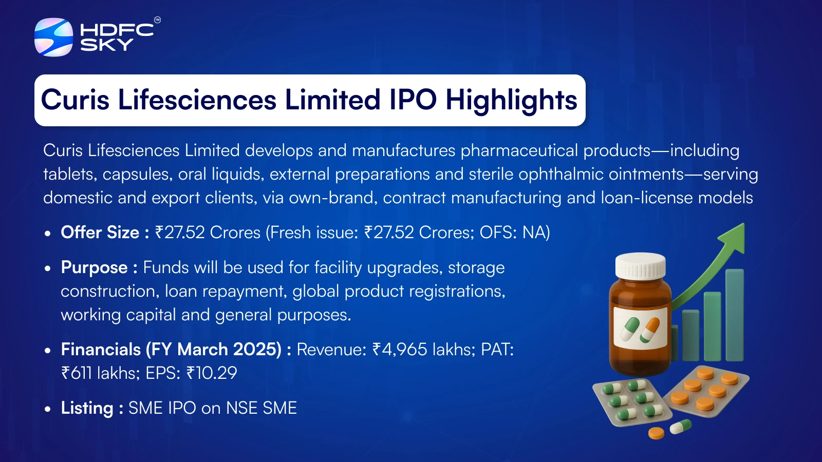 Incorporated in 2010, Curis Lifesciences Limited is a pharmaceutical company engaged in the development, manufacturing, and distribution of a wide range of pharmaceutical products. The company operates both globally and domestically on a loan licence or contract manufacturing basis, along with its own brand marketing. It caters to over 100 corporate clients and serves two international clients in Yemen and Kenya. Its product portfolio includes tablets, capsules, oral liquids, external preparations, and sterile ophthalmic ointments, manufactured at its advanced Sanand, Gujarat facility.