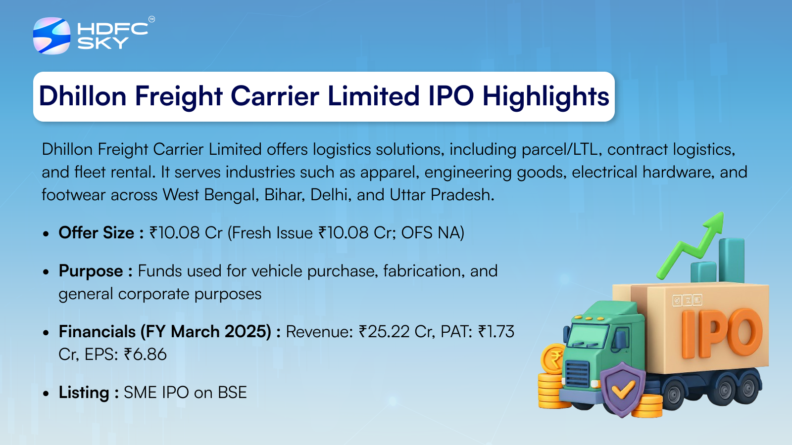 Dhillon Freight Carrier Limited’s IPO is a fixed price issue aggregating ₹10.08 crore, entirely through a fresh issue of 0.14 crore shares. The IPO opens for subscription on 29 September 2025 and closes on 1 October 2025, with allotment expected to be finalised on 3 October 2025. It is set to list on BSE SME, tentatively on 7 October 2025. Priced at ₹72 per share, the IPO has a lot size of 1,600 shares. Retail investors must invest a minimum of ₹2,30,400 (3,200 shares), while HNI investors require a minimum of 3 lots (4,800 shares), amounting to ₹3,45,600. Finshore Management Services Ltd. is the book running lead manager, Kfin Technologies Ltd. is the registrar, and Anant Securities is the market maker.