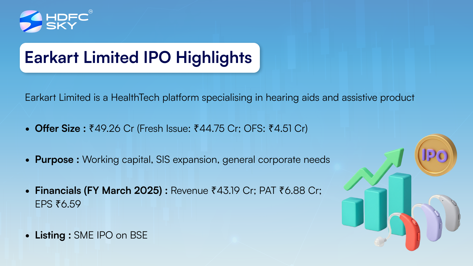 Earkart Limited is a HealthTech platform that designs, manufactures, and distributes hearing aids and related assistive products. Its portfolio includes Receiver-In-Canal (RIC), Invisible (IIC), Behind-The-Ear (BTE), In-The-Ear (ITE), In-The-Canal (ITC), and Completely-In-Canal (CIC) devices. The company also supplies walkers, multi-sensory educational kits, and teaching materials for differently-abled individuals.