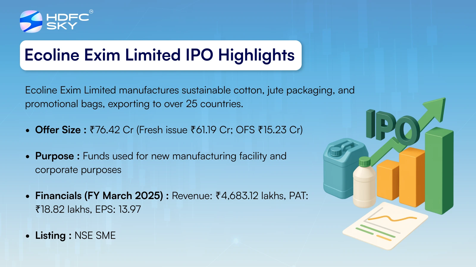 Ecoline Exim Limited specialises in manufacturing sustainable cotton, jute packaging, and promotional bags for the global market. The company exports its products to over 25 countries, including the European Union, the USA, Japan, Southeast Asia, and Mexico. Acting as an OEM, it provides packaging solutions for supermarkets, retail chains, wholesalers, and promotional companies. By September 30, 2024, Ecoline Exim had sold products to 48 customers for functional purposes and 24 customers for promotional needs. As of December 31, 2024, the company had an outstanding order book worth ₹97.44 crore for cotton and jute bags from approximately 60 customers. By January 2025, the company operates three manufacturing units, with one in Ahmedabad, Gujarat, and two in West Bengal. As of September 30, 2024, it employed 267 people across its various locations, reflecting its operational scale and market presence.