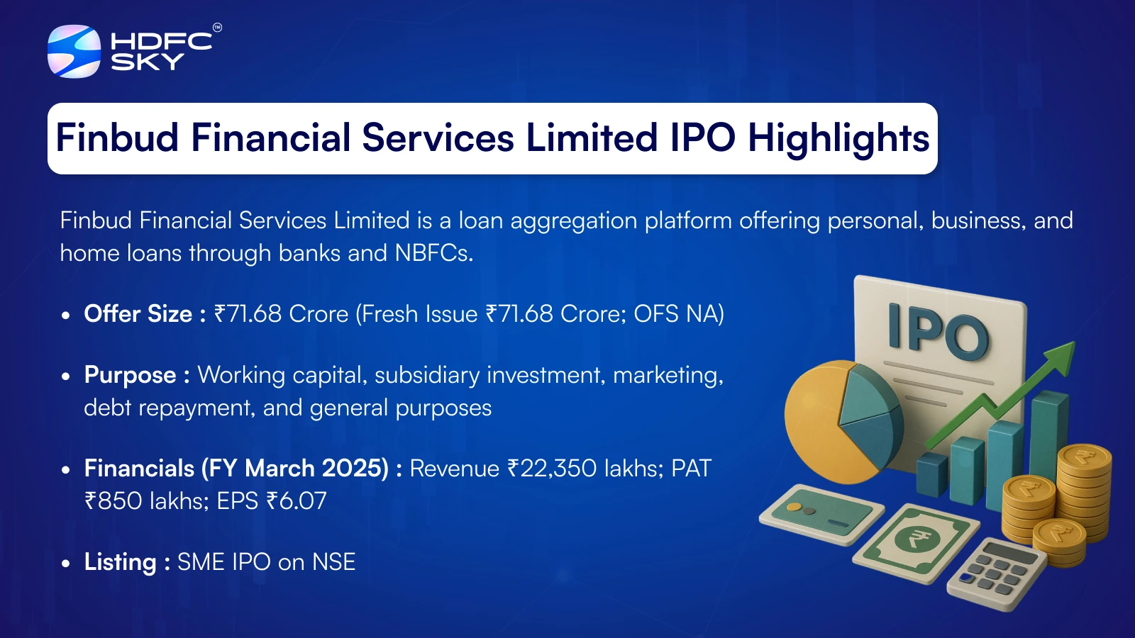 The Finbud Financial IPO is a book-built issue worth ₹71.68 crore, comprising a completely fresh issue of 0.50 crore equity shares. The IPO will open for subscription on November 6, 2025, and close on November 10, 2025. The basis of allotment is expected to be finalised on November 11, 2025, and the company’s shares are scheduled to list on the NSE SME platform on November 13, 2025.