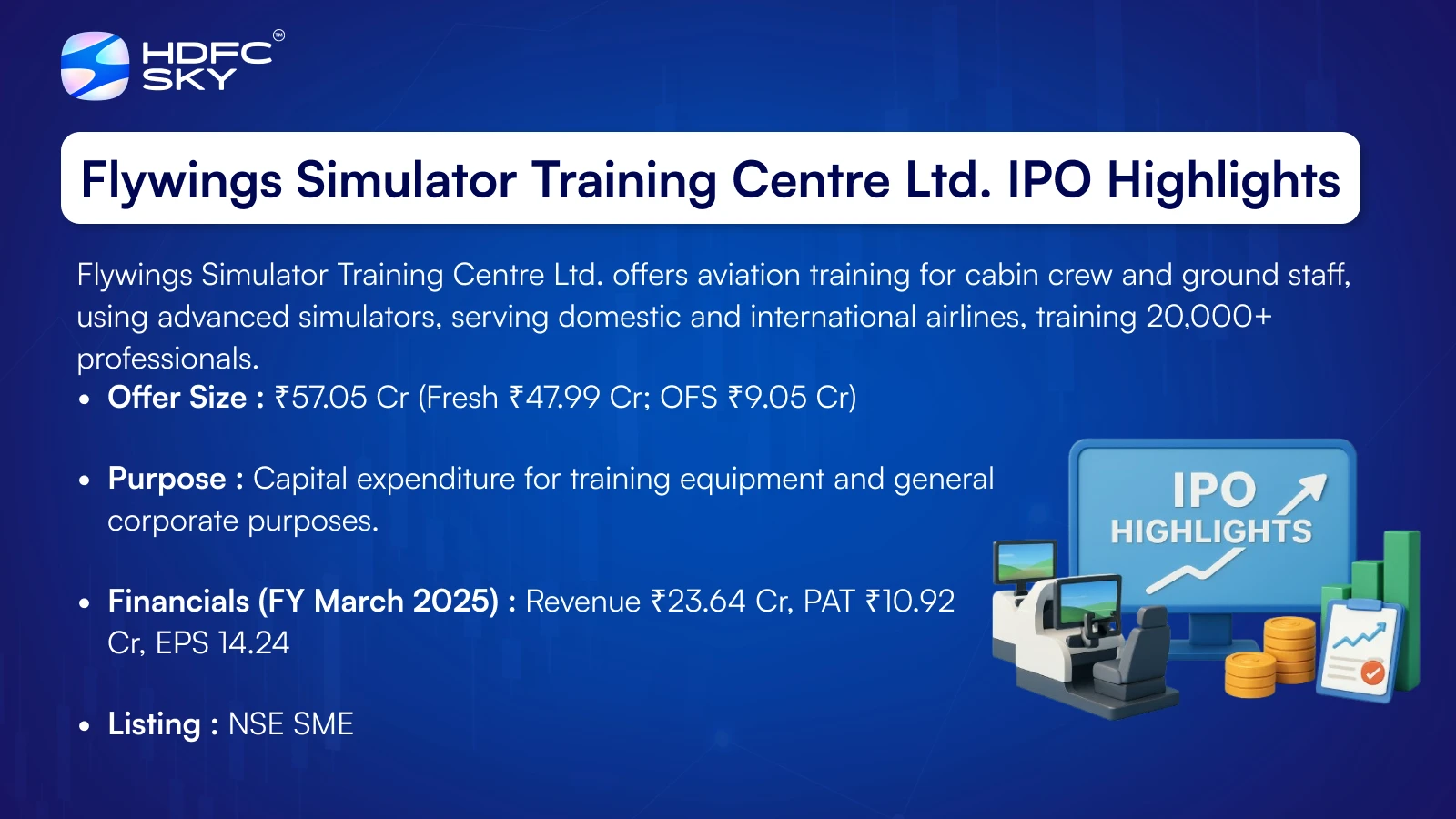Flywings Simulator Training Centre IPO is a book-built issue worth ₹57.05 crore, consisting of a fresh issue of 0.25 crore shares aggregating ₹47.99 crore and an offer for sale of 0.05 crore shares aggregating ₹9.05 crore. The IPO opens on 5 December 2025 and closes on 9 December 2025, with allotment expected on 10 December 2025. The company will list on NSE SME, with a tentative listing date of 12 December 2025. The price band is ₹181–₹191 per share, with a lot size of 600 shares. Gretex Corporate Services Ltd. is the book-running lead manager, Bigshare Services Pvt. Ltd. is the registrar, and Gretex Share Broking Pvt. Ltd. is the market maker.