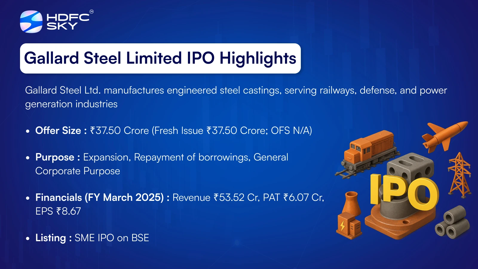 The Gallard Steel IPO is a book-built issue worth ₹37.50 crore, consisting entirely of a fresh issue of 25 lakh shares. The IPO opens for subscription on 19 November 2025 and closes on 21 November 2025, with allotment expected to be finalized on 24 November 2025. It is set to list on BSE SME, with a tentative listing date of 26 November 2025.