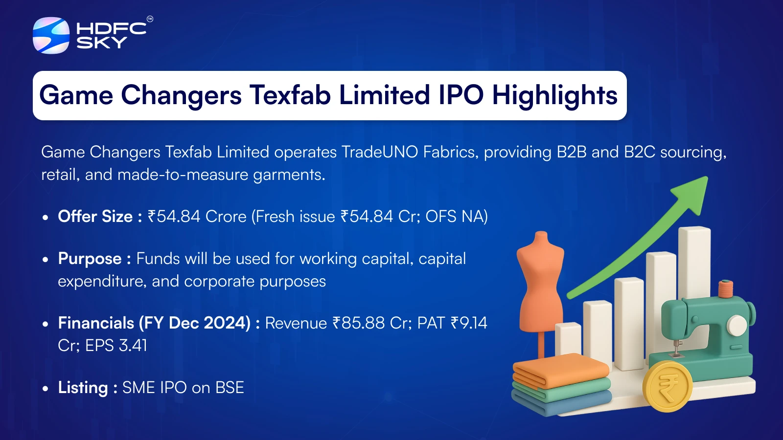 Game Changers Texfab Ltd. is launching a book-built IPO worth ₹54.84 crores, consisting entirely of a fresh issue of 0.54 crore shares. The IPO will open for subscription on 28 October 2025 and close on 30 October 2025, with allotment expected on 31 October 2025. It is slated to list on BSE SME on 4 November 2025. The price band is ₹96 to ₹102 per share, with a lot size of 1,200 shares. Retail investors must invest a minimum of ₹2,44,800 (2,400 shares), while HNI investors require at least 3 lots (3,600 shares), totaling ₹3,67,200. Corpwis Advisors Pvt. Ltd. is the lead manager, Skyline Financial Services Pvt. Ltd. is the registrar, and NNM Securities Pvt. Ltd. serves as the market maker.