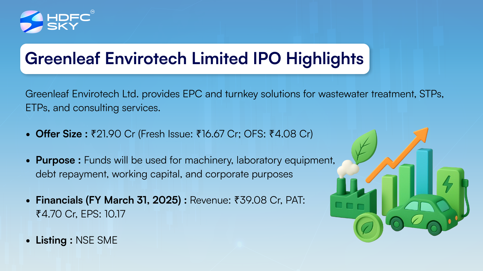Greenleaf Envirotech Limited’s IPO is a fixed price issue worth ₹21.90 crore, comprising a fresh issue of 0.13 crore shares aggregating ₹17.82 crore and an offer for sale of 0.03 crore shares worth ₹4.08 crore. The IPO opens for subscription on 30 September 2025 and closes on 6 October 2025, with allotment expected on 7 October 2025. It will list on NSE SME, tentatively on 9 October 2025. Priced at ₹136 per share, the minimum retail investment is ₹2,72,000 for 2,000 shares, while HNI investors must apply for at least 3,000 shares (₹4,08,000). Smart Horizon Capital Advisors Pvt. Ltd. is the book running lead manager, Kfin Technologies Ltd. is the registrar, and Rikhav Securities Ltd. acts as the market maker.