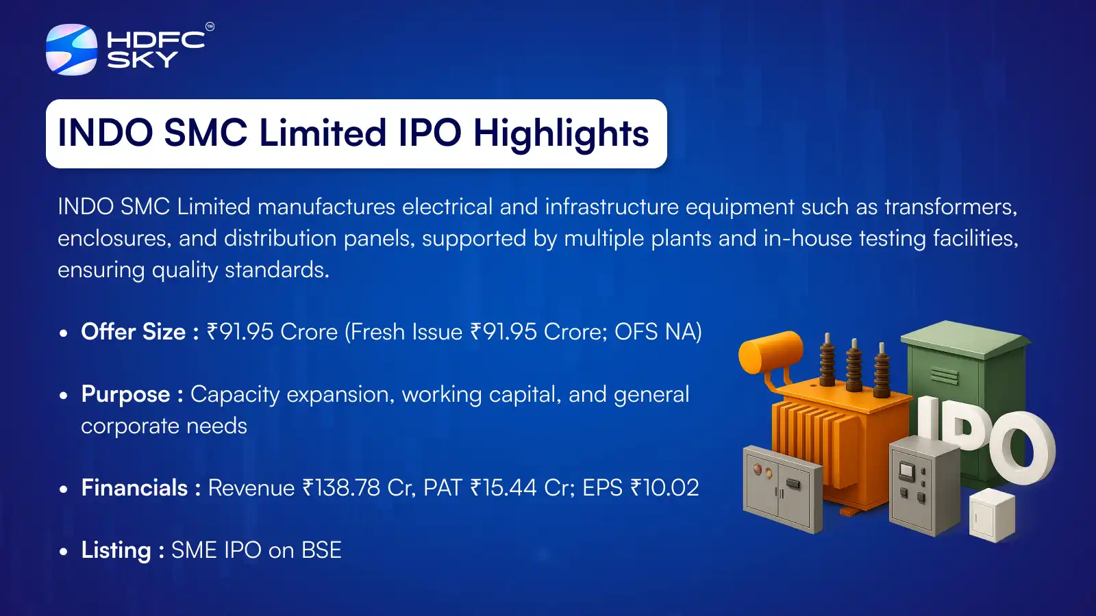 The INDO SMC IPO is a book-building issue of ₹91.95 crore consisting entirely of a fresh issue of 0.62 crore shares. The IPO opens on 13 January 2026 and closes on 15 January 2026, with allotment expected on 16 January 2026 and listing scheduled on 20 January 2026 on the BSE SME platform. The price band is fixed at ₹141 to ₹149 per share with a lot size of 1,000 shares. GYR Capital Advisors Private Limited is the book-running lead manager, and Kfin Technologies Limited is the registrar. Giriraj Stock Broking and Nikunj Stock Brokers act as market makers.
