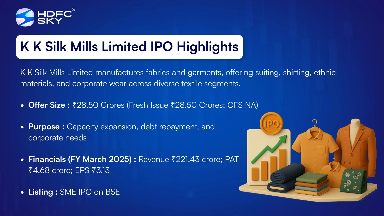 K K Silk Mills IPO is a book-built issue of ₹28.50 crore, comprising a fresh issue of 0.75 crore shares. The subscription window opened on 26 November 2025 and will close on 28 November 2025, with allotment expected on 1 December 2025. The IPO is proposed to list on BSE SME on 3 December 2025. The price band is set at ₹36 to ₹38 per share, with a lot size of 3,000 shares. The minimum retail investment stands at ₹2,28,000 for 6,000 shares at the upper band, while HNI investors must apply for at least three lots (9,000 shares) amounting to ₹3,42,000. Axial Capital Pvt. Ltd. is the book-running lead manager, MUFG Intime India Pvt. Ltd. is the registrar, and Aftertrade Broking Pvt. Ltd. is the market maker.