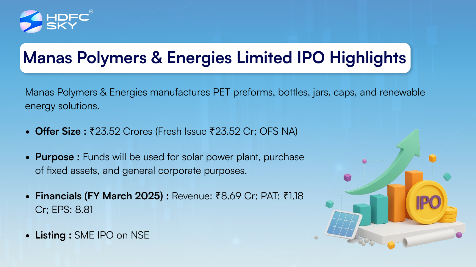 Manas Polymers & Energies Limited IPO is a book building issue of ₹23.52 crore, consisting entirely of a fresh issue of 0.29 crore shares. The IPO opens for subscription on 26 September 2025 and closes on 30 September 2025, with allotment expected to be finalized on 1 October 2025. The shares are planned to list on NSE SME, tentatively on 6 October 2025. The issue price band is set between ₹76 and ₹81 per share, with a lot size of 1,600 shares. Retail investors are required to invest a minimum of ₹2,59,200 for 3,200 shares at the upper price, while HNIs must apply for at least three lots (4,800 shares), amounting to ₹3,88,800. Expert Global Consultants Pvt. Ltd. is the book running lead manager, and Purva Sharegistry (India) Pvt. Ltd. is the registrar for the issue.