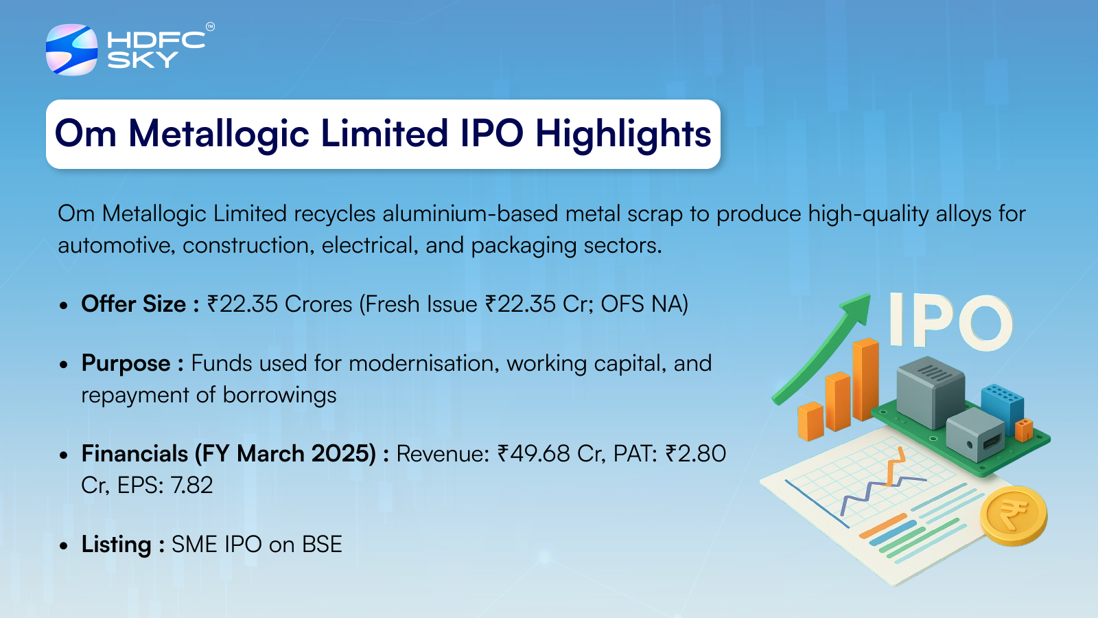 Om Metallogic IPO is a fixed price issue of ₹22.35 crores, comprising entirely a fresh issue of 0.26 crore shares. The IPO opens for subscription on 29 September 2025 and closes on 1 October 2025, with allotment expected to be finalized on 3 October 2025. The shares are set to list on BSE SME, tentatively on 7 October 2025. The issue price is ₹86 per share, with a lot size of 1,600 shares. For retail investors, the minimum investment is ₹2,75,200 for 3,200 shares, while HNI investors must invest a minimum of 3 lots (4,800 shares) amounting to ₹4,12,800. Corporate Makers Capital Ltd. is the book running lead manager, and Skyline Financial Services Pvt. Ltd. is the registrar of the issue.