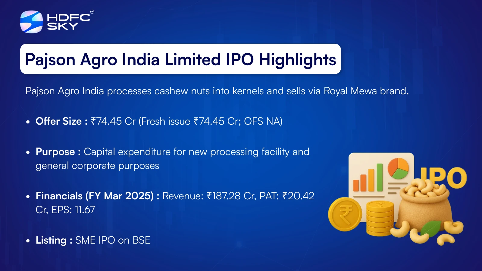 Incorporated in 2021, Pajson Agro India Limited processes raw cashew nuts into cashew kernels and sells them domestically and internationally. The company markets bulk and retail products under its white-label brand Royal Mewa. By-products like cashew husk and shells are sold for industrial and agricultural use. Its 295,990 sq. ft. processing facility in Visakhapatnam, Andhra Pradesh, handles shelling, peeling, cleaning, grading, and packaging. Operating in 18 states and 3 Union Territories, the company employs 465 permanent staff. It leverages promoter expertise, modern machinery, and strong distribution networks to ensure product quality and market reach.