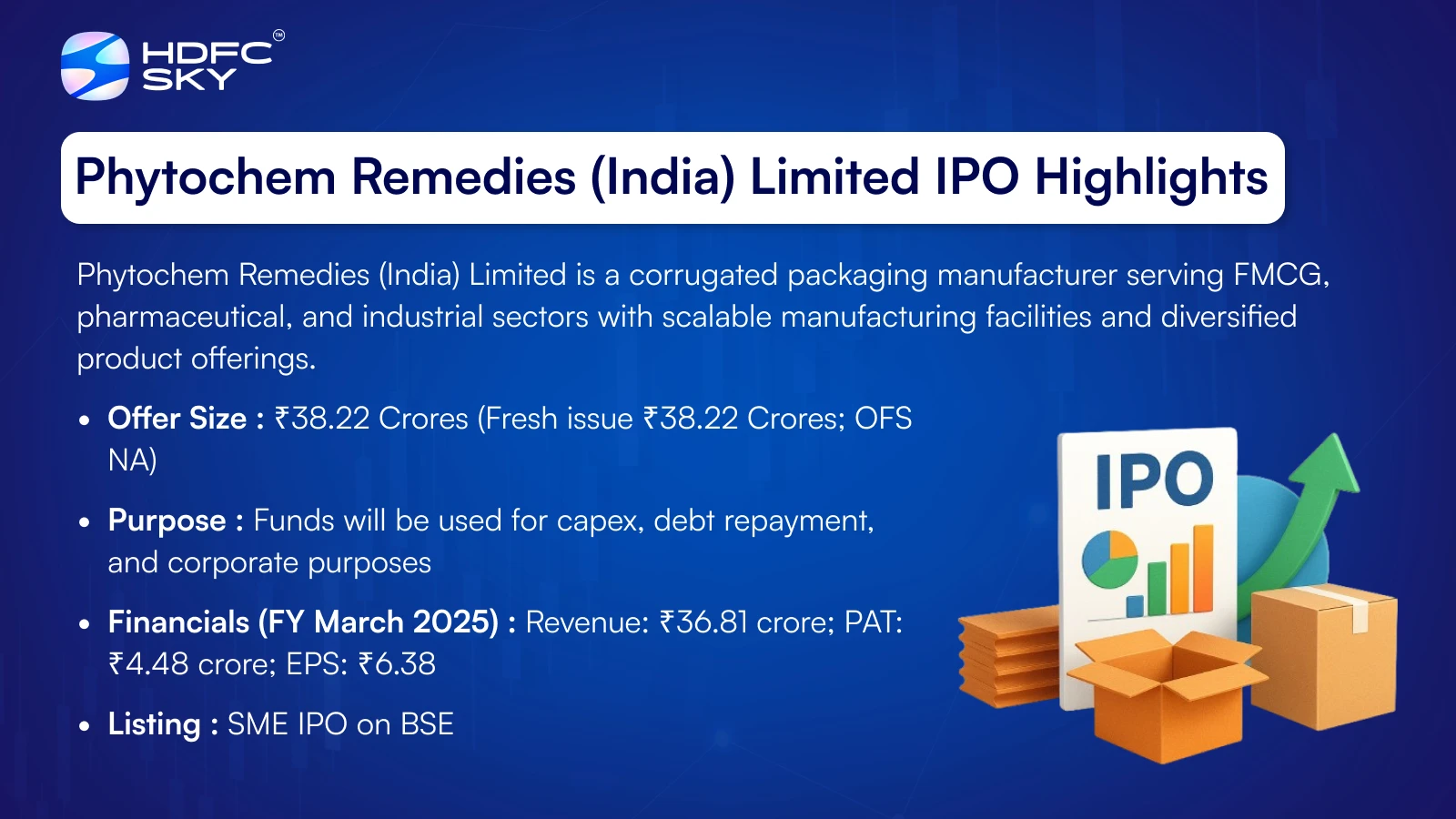Phytochem Remedies (India) Limited, incorporated in 2002, is engaged in manufacturing corrugated boxes and corrugated board packaging solutions. The company caters to FMCG, food and beverages, pharmaceuticals, pesticides, and automotive industries. It operates two manufacturing units located at Bari Brahmana, Jammu, equipped to produce multi-ply corrugated boxes, printed boxes, rolls, pads, and sheets. The company focuses on quality standards, operational efficiency, and long-term customer relationships while maintaining scalable infrastructure to support future expansion and growing industry demand.