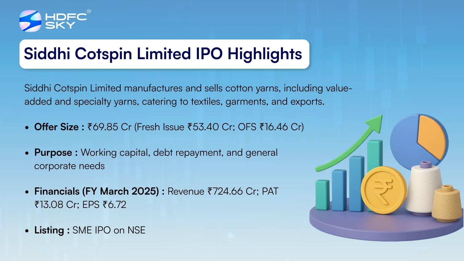 You can apply for Siddhi Cotspin Limited IPO online via HDFC Sky using UPI-based ASBA payment.