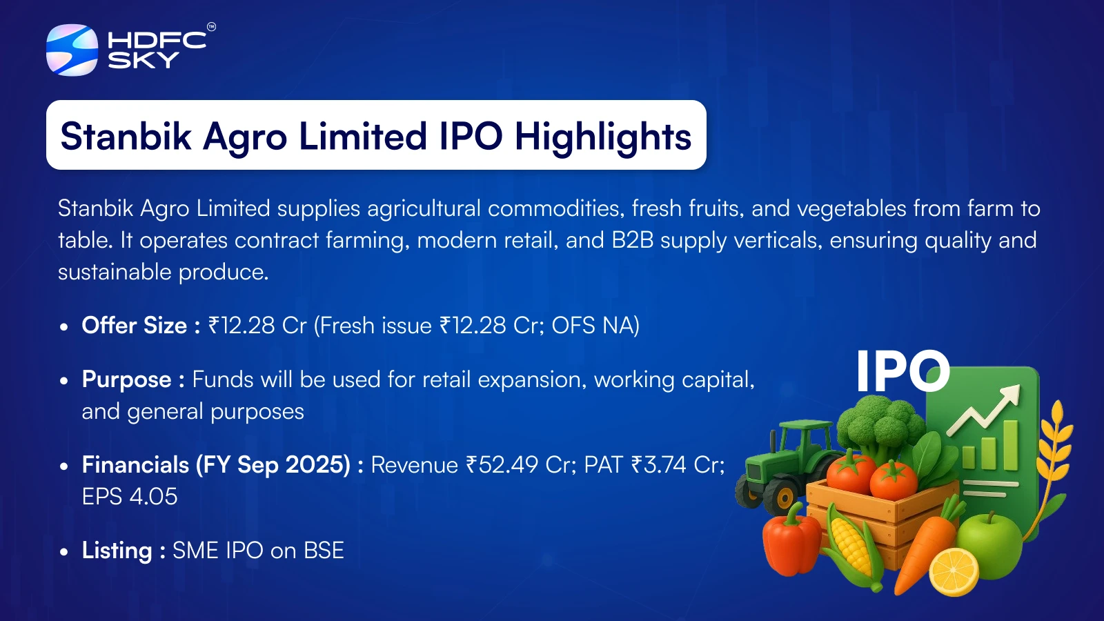 Stanbik Agro Limited IPO is a fixed price issue aggregating ₹12.28 crore, entirely a fresh issue of 40,92,000 shares. The IPO opens on 12 Dec 2025 and closes on 16 Dec 2025. Tentative allotment is scheduled for 17 Dec 2025, with refunds and demat credit on 18 Dec 2025, and listing on BSE SME on 19 Dec 2025. The issue price is ₹30 per share, with a lot size of 2,000 shares for retail investors. Grow House Wealth Management Pvt. Ltd. is the lead manager, Purva Sharegistry (India) Pvt. Ltd. is the registrar, and Mnm Stock Broking Pvt. Ltd. is the market maker.