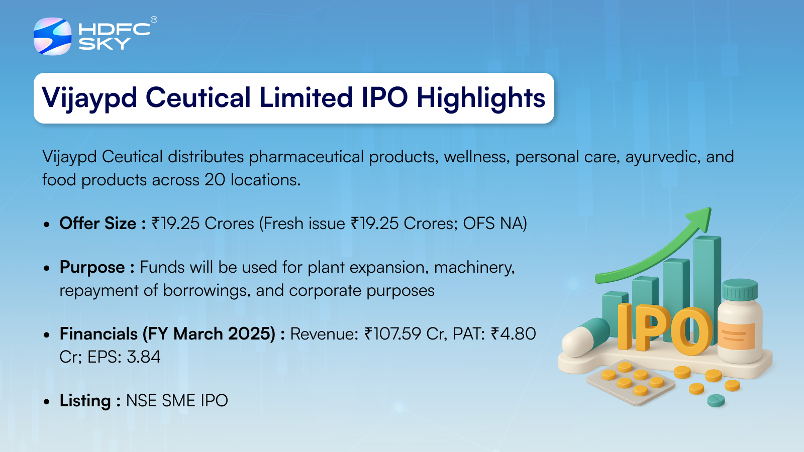 Vijaypd Ceutical IPO is a fixed-price issue of ₹19.25 crore, comprising entirely a fresh issue of 0.55 crore shares. The IPO opens for subscription on 29 September 2025 and closes on 1 October 2025, with allotment expected to be finalised on 3 October 2025. The shares will be listed on NSE SME, tentatively on 7 October 2025. Priced at ₹35 per share, the lot size is 4,000 shares, with a minimum retail investment of ₹2,80,000 (8,000 shares) and HNI investment starting at ₹4,20,000 (12,000 shares). Smart Horizon Capital Advisors Pvt. Ltd. is the book running lead manager, Kfin Technologies Ltd. is the registrar, and Shreni Shares Ltd. is the market maker.