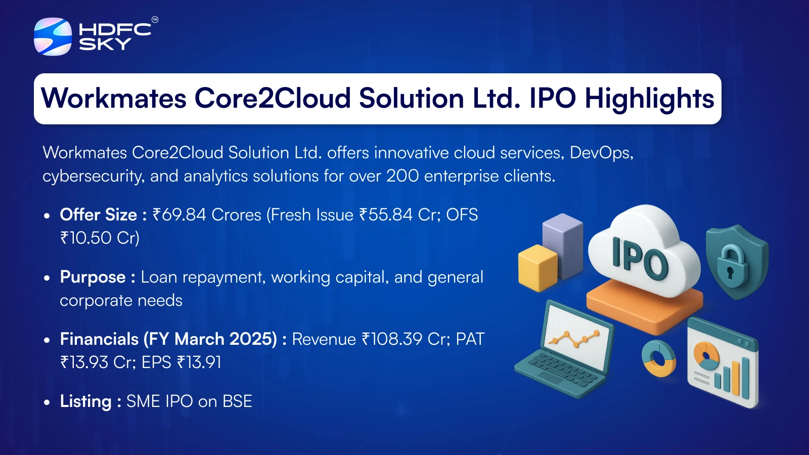 The Workmates Core2Cloud IPO is a book-built issue amounting to ₹69.84 crore. It comprises a fresh issue of 0.29 crore shares, aggregating to ₹59.34 crore, and an offer for sale (OFS) of 0.05 crore shares, aggregating to ₹10.50 crore. The IPO will open for subscription on 11 November 2025 and close on 13 November 2025, with the allotment expected on 14 November 2025. The shares are proposed to be listed on the BSE SME platform, with a tentative listing date of 18 November 2025.